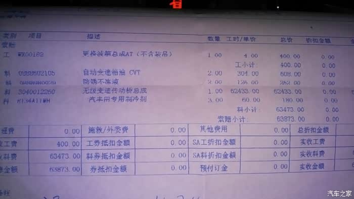 现在刚换的还不知道效果怎么样,试车半个小时暂没问题。怠速时的声音和旁边做保养的新卡声音差不多,没换之前那个响声真是不敢恭维,好像散架了一样(像7.8年的旧车)。有上述变速箱异响的自己看维修单(63873元)。要是出保后坏了就要自己掏钱了。