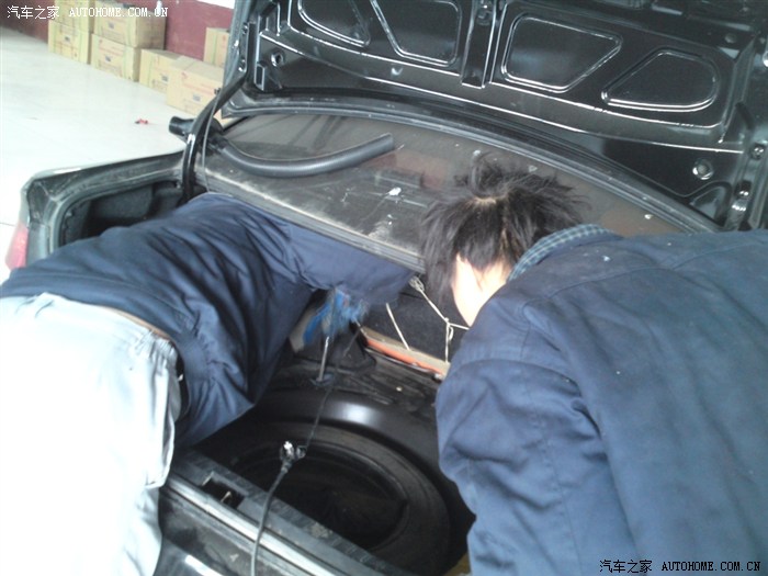 5个师傅分工合作,两个在后备箱忙活,三个在前面,先把后备箱打孔