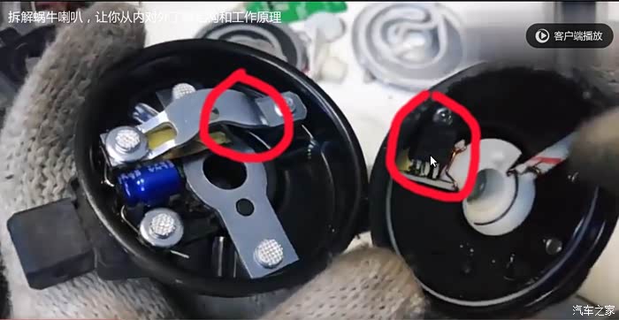 有两种截然不同的结构:左边的是机构蜗牛喇叭,也是早期产品的结构,现在大多数产品仍然采用这种结构。很简单的原理,就是电磁铁供电运动,顶开触点,电磁铁失电,触点又接通,如此反复,带动振膜运动产生声音。而右边的电子蜗牛,因大电流电子元件的产生,才有了这种结构。由振荡电路产生音频信号,驱动大功率场效应管,再控制电磁铁得失电工作,振膜就产生往复运动而发声。前者的机械触点,大电流工作时会慢慢烧蚀,还有可能机械件产生位移,可能会变声或失声。后者无机械触点,稳定性耐久性应该更好一些。