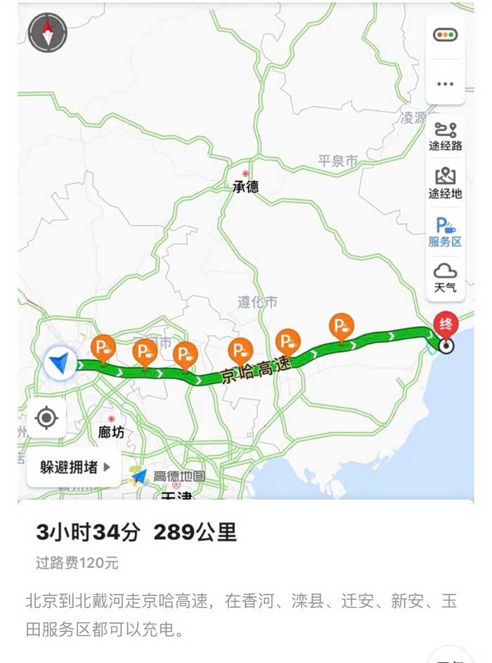 120公里每小时的时速,其实中途不用补电完全也可以到达北戴河~