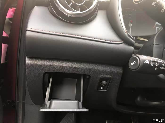 除了门板上有两个储物槽,方向盘的左下方还有一个可以打开的小抽屉,用来放放零钱票据和高速通行卡是不错的选择。