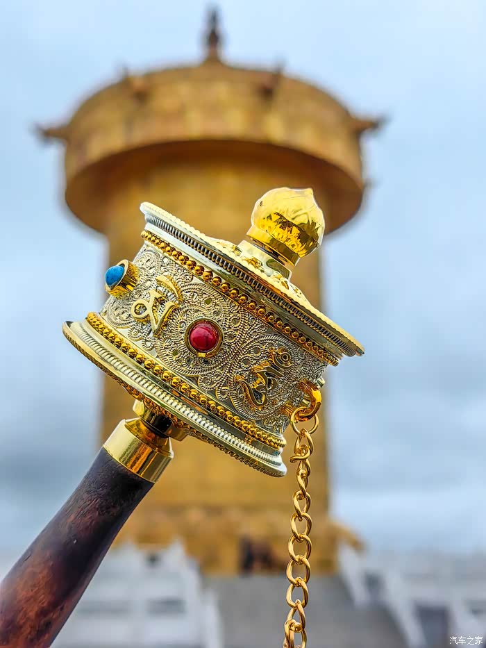 筒体浮雕由尼泊尔工匠纯手工锻铸鎏金而成,用黄金60公斤。外部镶嵌浮雕佛像,花纹贴纯黄金金箔1160㎡,内部藏有经书约11万册,是甘南藏地最具有代表意义的建筑,成功刷新吉尼斯记录。