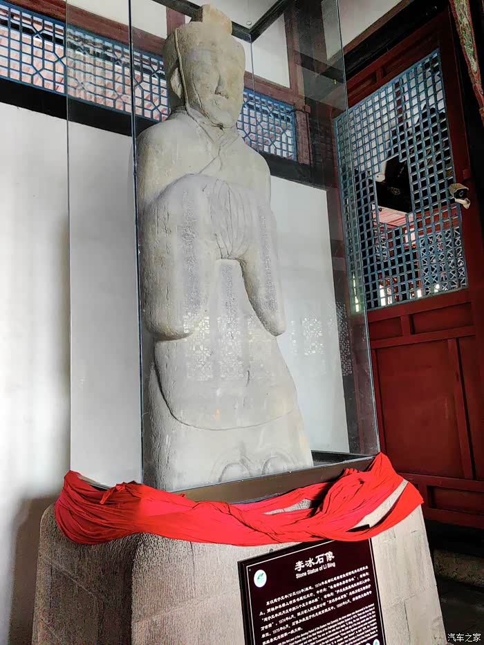 1974年修建外江节制闸时从河床中挖出的李冰石刻像,高2.9米,重4.5吨。石像造于东汉灵帝初年,距今已1800多年,是我国现存最早的圆雕石像,非常珍贵。