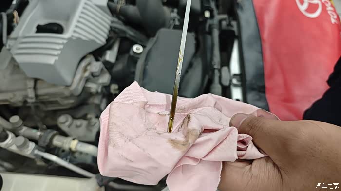 师傅检查了一下机油,发动机换了新机油后运转了15分钟,然后再检查机油,机油就有略微变黑,说明这个车子里面积碳还是不少的,可能会有油泥,看来以后保养呀,再轻一点,轻换油,机油黑说明燃烧状况就不好,可能曲轴箱有串气,所以才会变黑。