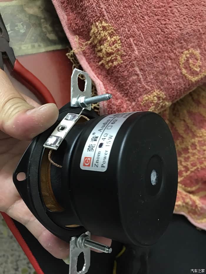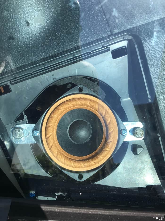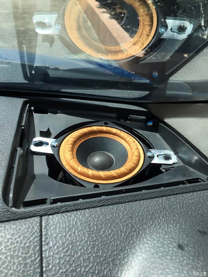 2、仪表台放置喇叭,原装为4寸孔,但是建议采用3寸喇叭。由于原装4寸喇叭的磁铁比较小可以放下,还用用好的喇叭,会由于磁铁太大放不下这个孔。而3寸喇叭由于螺丝孔位对不上所以需要改装,我采用的是用铝片延长螺丝孔位,不建议用塑料,在车内高温,长久下去塑料会腐化。并且金属的固定性比较强。