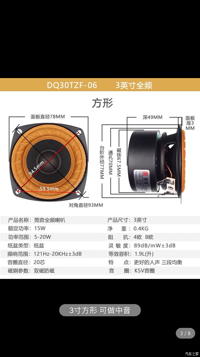 采用的是莞音的3寸全频喇叭,适合做中音。这图的作用是要参考螺丝孔距以及整体厚度。确定好大小能不能装上仪表台喇叭孔。