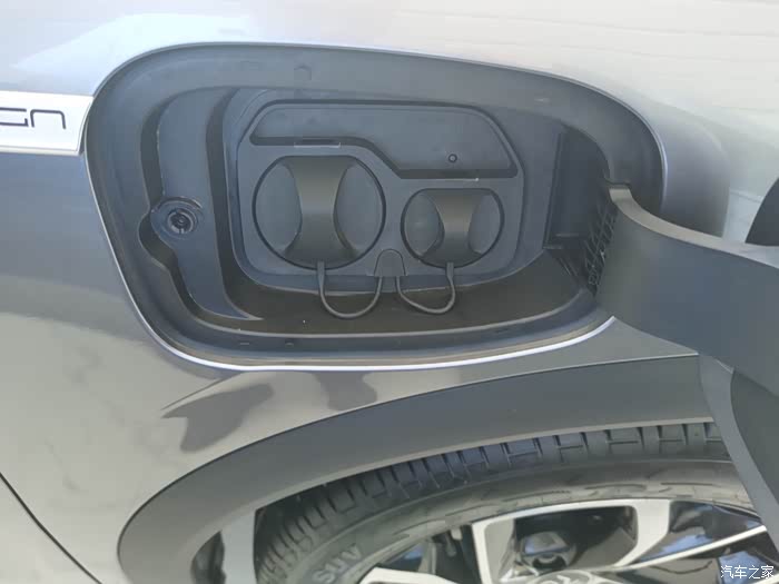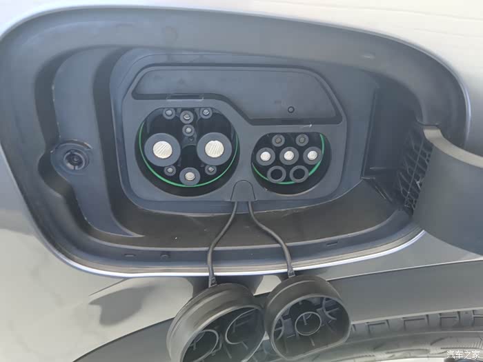 车的副驾驶的车门这边呢,就是我们的充电口在这个位置呢我们轻轻的按压,可以看到这里面是有带两个充电头的,我们有加一个防水的保护套,是一个非常严实的一个防水的保护套,这个小一点的七个孔的是我们的交流慢充,这个大的那三个孔的是我们的直流快充,充电是非常方便的。