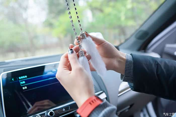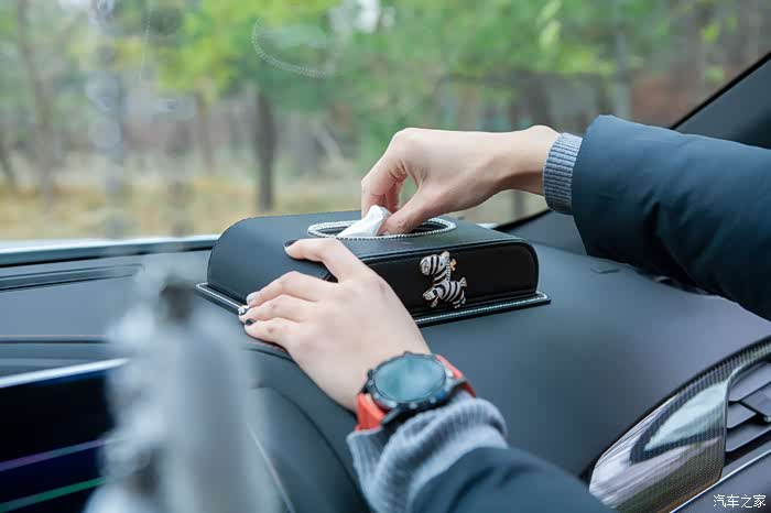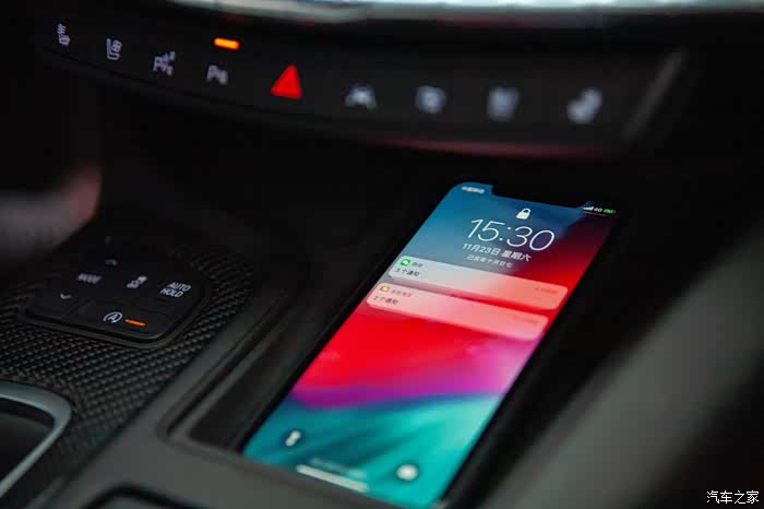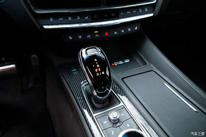 换挡区域最吸引我眼球的就是犹如水晶裆把的全新电子裆把,没办法,女生天生对BLING BLING的东西没有抵抗力。真碳纤维的覆盖件,也显示了我运动版本的身份。右前方的无线充电也是非常的方便,而且凯迪拉克贴心的在扶手箱内开了一个放手机的孔位,下方还有导线孔,这样不仅可以支持车上俩人同时充电,而且也不会显得车里很乱,真的很贴心。