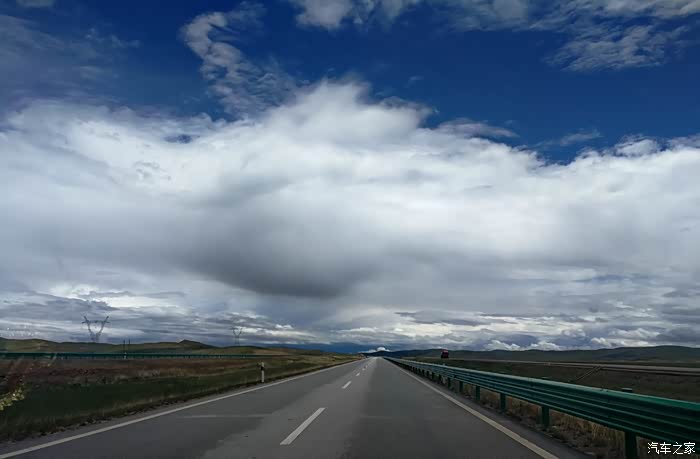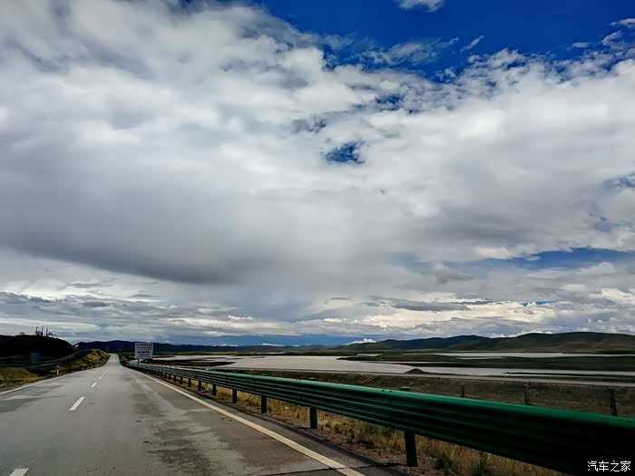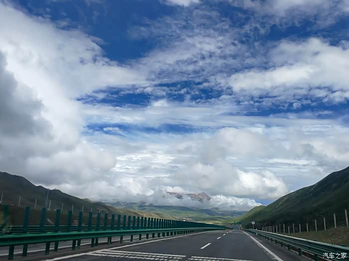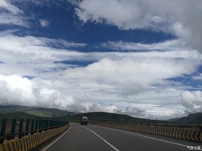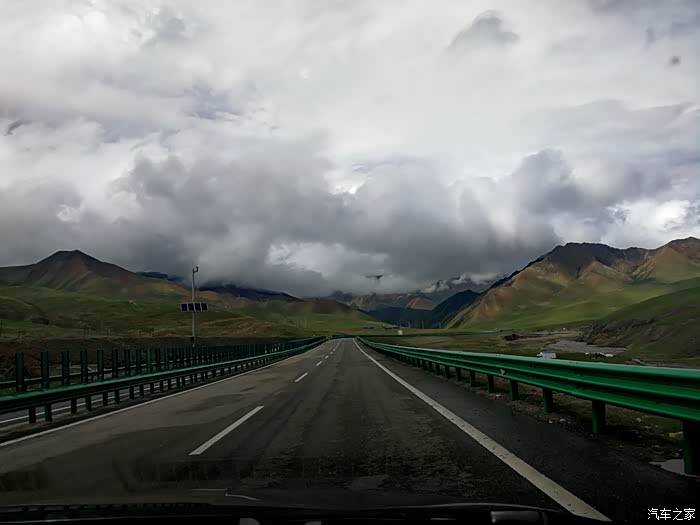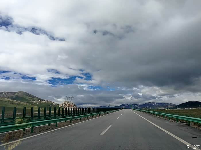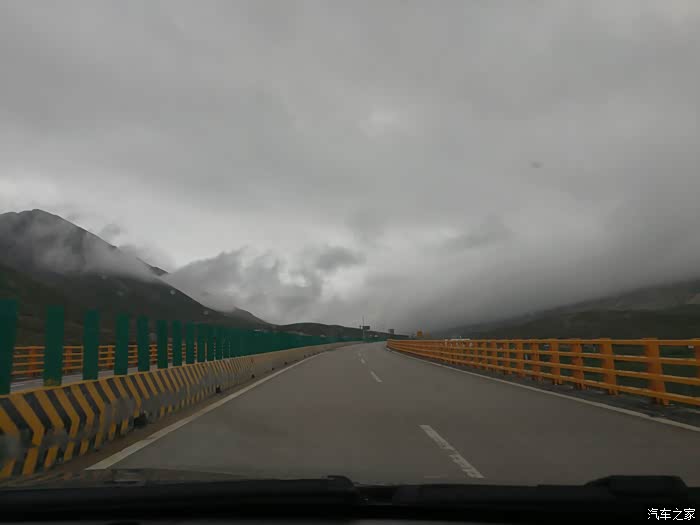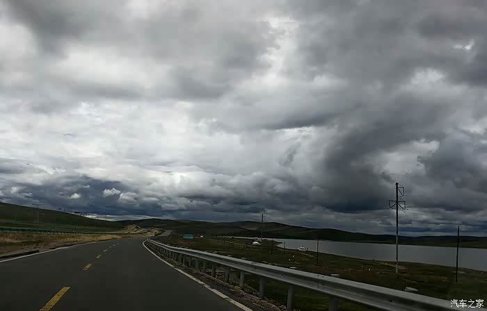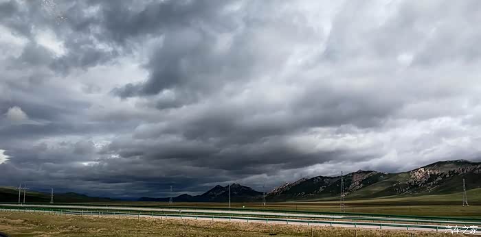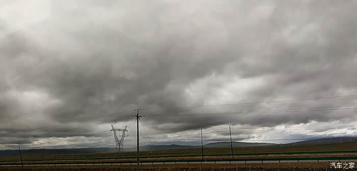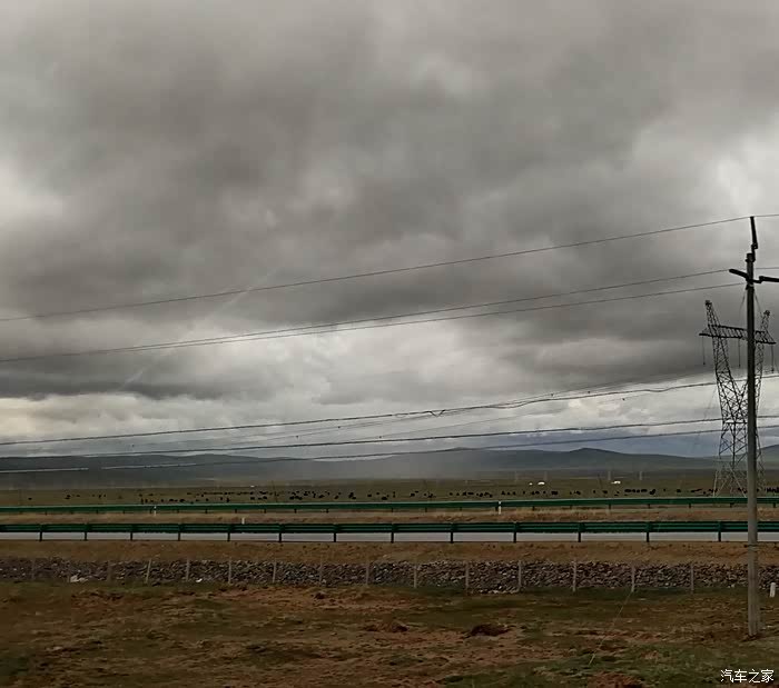 玛多县的天气是多变的,20分钟后继续赶路。路过花石峡后,在立交桥处就看到了远处的云墙,我们又要面对不断变化的天气,好在能见度极佳,将近2000米的落差行程中,风云变幻尽收眼底。