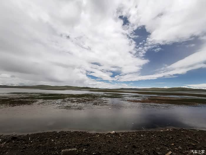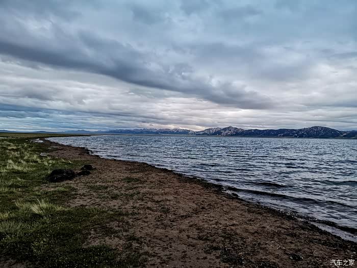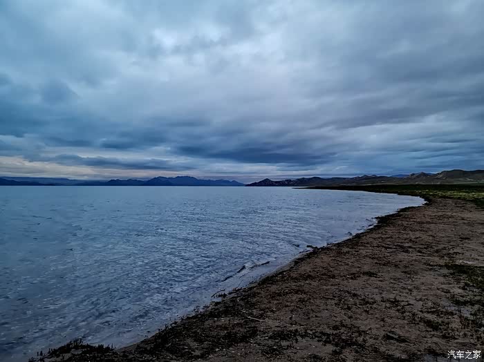 六点多钟,天色微明,大货车进场的刹车声惊醒了我们,新的一天开始了。下车后还是感觉到湖畔微风带来的一丝凉意,昨晚虽然阴云密布,并没有下雨,湖畔草地上的积水并无加深。冬给错那湖昨日的镜面,已经在微风拂煦下泛起涟漪,呈现出一派海水的淡蓝色,伫立岸边可以感受到微波的拍击声。虽然湖边的能见度并不低,对面的山岚地貌依稀可见,但是漫天阴霾的云层,还有那翻滚前行的状态,基本上埋葬了今天的希望,连水鸟的鸣叫都不曾听闻。