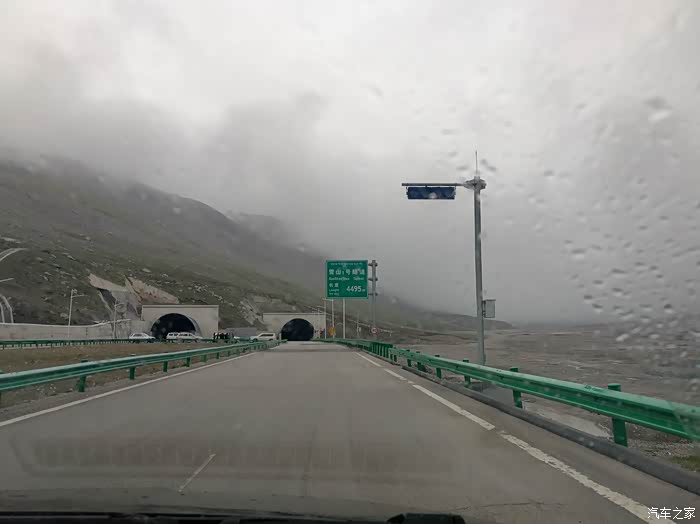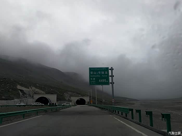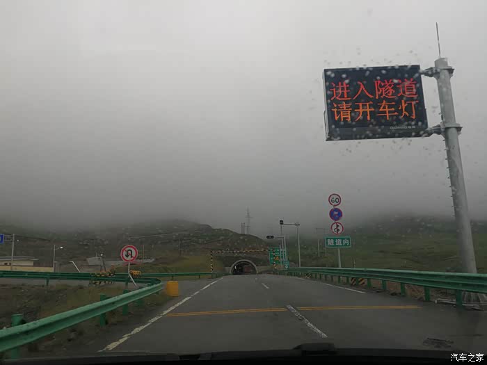 看到山间飘荡的云雾,山朦胧心也朦胧!我们已经商量掉头了,这种云遮雾罩状态,想看到神山和冰川是毫无希望的,何况下高速后还有20多公里的泥泞县道,便开始寻找掉头的豁口。转弯见到雪山一号隧道的标牌,长度4495米,隧道口有一个转弯豁口,但是被四辆丰田车堵住了。近前询问,他们是玉树的藏民,要到阿***卿山朝圣,停车商量从哪里下高速。此刻阴云密布,天色灰暗,雨雾蒙蒙,开窗就感觉到寒意,我们也不做停留了,直接拐上回程,去花石峡吃早餐。