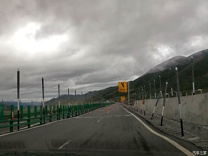 7点多钟进入高速,宽阔的大道上任我驰骋。缓坡的尽头,低矮的云层遮蔽了高山,在路面之间只留下一点点苍白的希望。到达坡顶,路牌上显示长下坡5km,天边的缝隙略微宽了一点,那里面云气搅动,如同孙悟空在大闹天宫。松开油门,任由车子快速下行,这时侧面拍照已经无法对焦了,只有前方的景象凑合。冬给错那湖到雪峰一号隧道的距离并不长,过了立交桥后也只有20多公里。