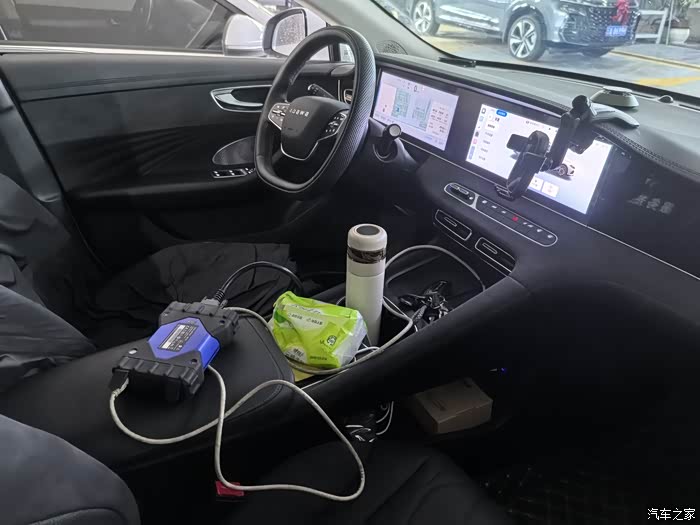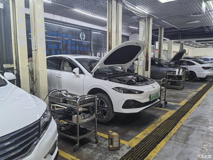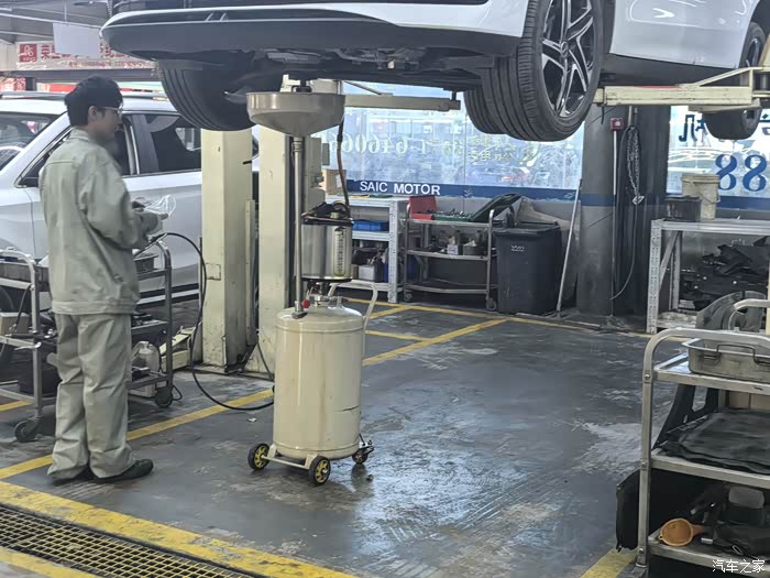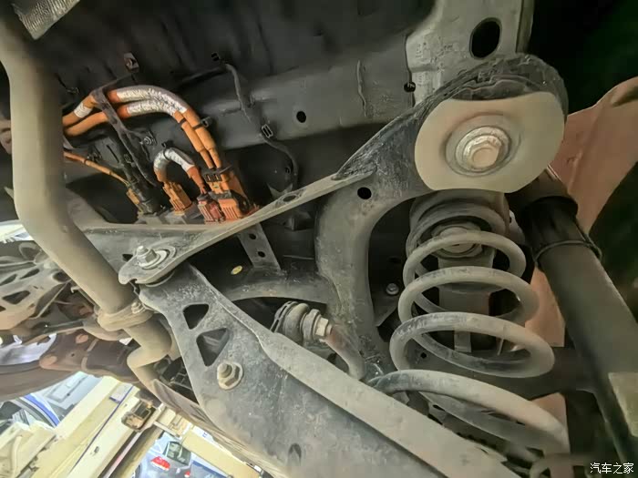 此次保养的核心目的之一就是检查维护三电系统。升起车辆,保养师傅仔细的检查了地盘情况,包括动力电池包、线束是否规整等,确认没有啥问题之后,简单地清洁了一下底盘。
