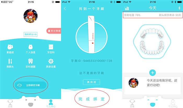 App的界面很简洁清新,天蓝色与白色互相搭配,让人感觉很清凉洁静。App跟牙刷是通过蓝牙连接的,打开蓝牙绑定就可以了,基本上是秒连,速度非常快。