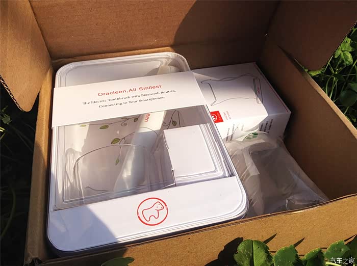 刚把包装拿出来的时候,其实外面还包裹了一层塑料膜。有一箱白色纸带环绕包装,其实是为了遮挡住玻璃杯,这样看上去更美观一些,而且标语口号都可以印在上面,all smiles(笑容满面)的口号,还有一些英文简单的介绍,看着挺高档的,其实就是说一个通过蓝牙跟智能手机连接的电动牙刷。。。