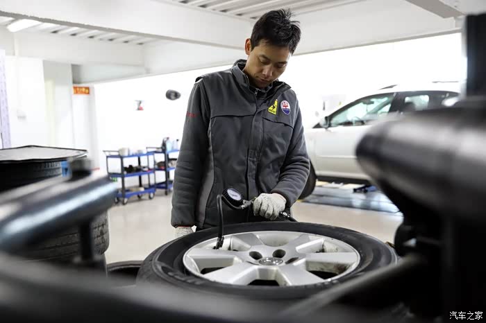 检查完之后开始为轮胎充气,通常而言标准胎压都在2.5bar左右。但也要因地制宜,不能什么季节都2.5bar。在这样的寒冬中我比较建议大家2.2bar左右,因为地面温度低轮胎的附着力相对较差,气压低一些会增大一些附着力提升行车安全。