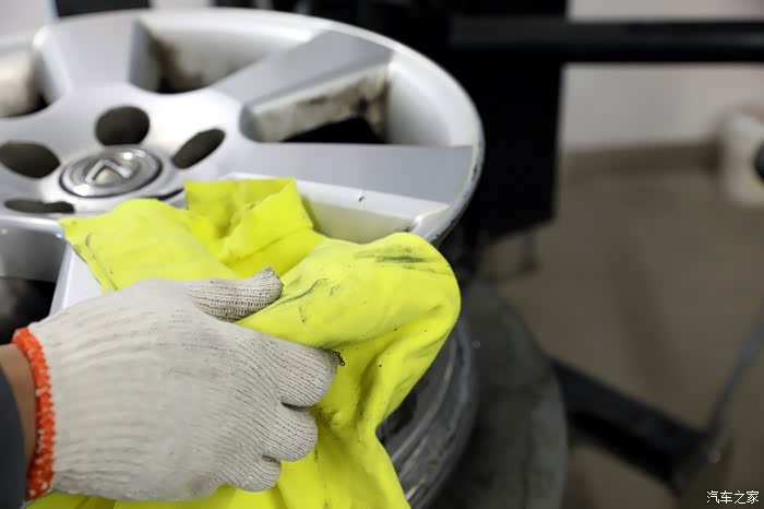 轮胎取下之后,由于胎口长时间与轮圈口配合,所以轮圈上回留有一些橡胶的污垢,这个时候一定要抹布或刷子将圈口擦干净,否则很容易出现新轮胎装好后慢撒气的现象。