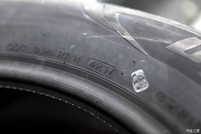 通常而言,轮胎的橡胶也是有寿命的,一般为5-6年或8-10万公里先到为准。轮胎上面会标注生产日期,譬如现在的这个4217则代表2017年第42周生产。那如果按照这么换算,这个轮胎的橡胶则在2022年到期。