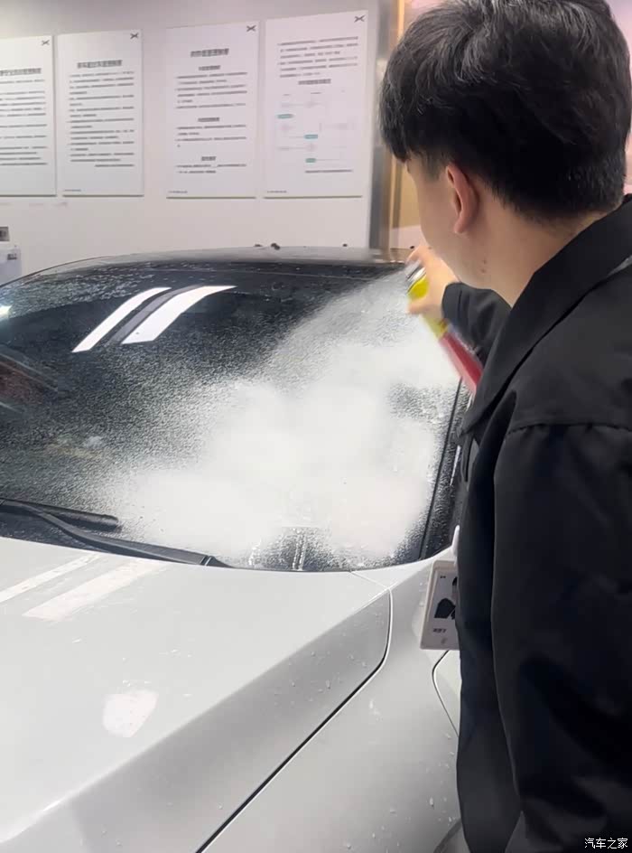 最暖心的当属福州小鹏仓山售后服务中心工作人员,亲自上手给我的胖虎前挡和后视镜玻璃喷上玻璃油膜去除剂,静置2-3分钟后,维保小哥再进行擦拭干净!