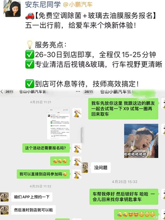 4月25日就在微信看见鹏厂官方“安东尼同学”的朋友圈,今年五一鹏厂推出了“免费空调除菌+玻璃去油膜”的服务,而且活动时间4.26~30日到店即享!本以为是需要报名才可以,结果咨询鹏福州小鹏仓山售后服务中心的工作人员,只需要在App上预约然后到店就可以安排!