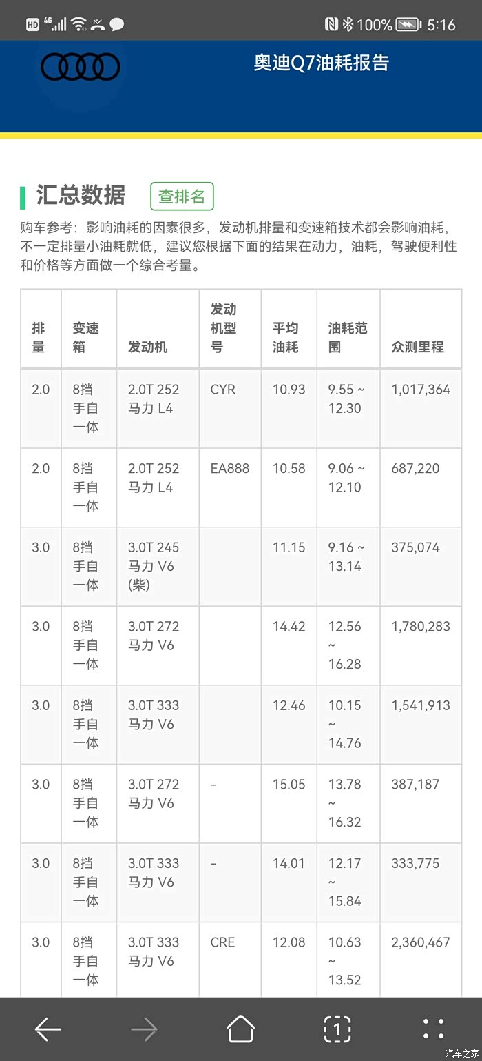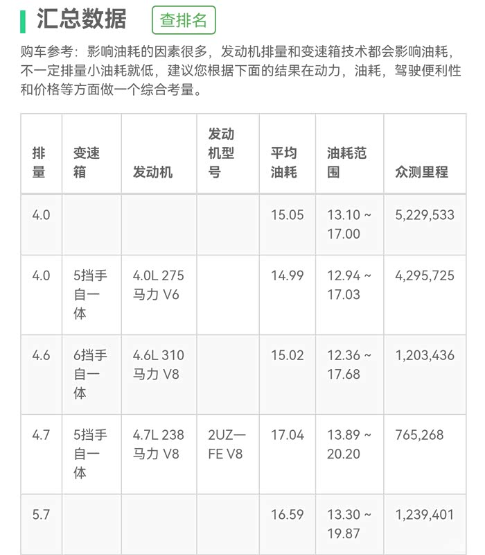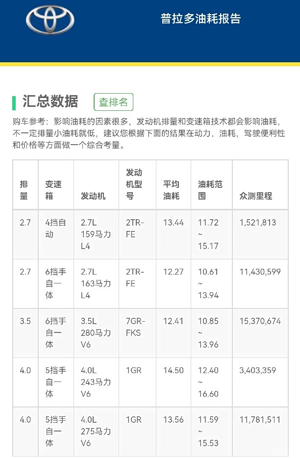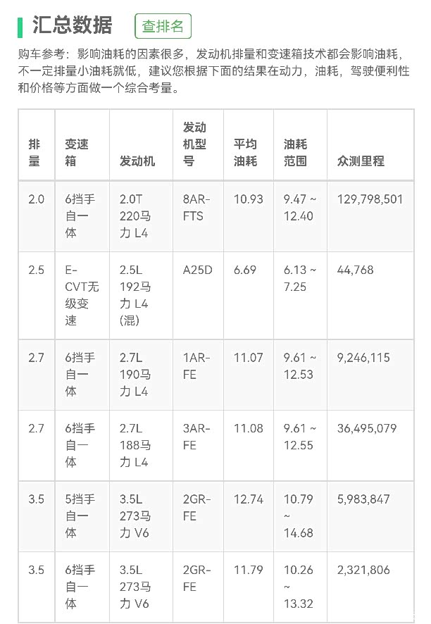 10、汉兰达2.0T 10.9,2.7油耗11.1 ,3.5油耗11.8,2.5混动油耗6.7