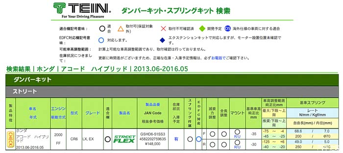 Tein JP —— StreetFlex有匹配九代雅阁日本仕样的避震机型号,问题出在,九代雅阁日本仕样车型是混动版本。后部有电池的重量,所以整车平衡和思铂睿不同。故,Tein在给他选择弹簧磅数时,保证支撑力足够的前提下,降低了前部磅数来达到重量分配,采用前7后5。所以这套绞牙如果在思铂睿上安装,就必须经过有经验的技师重做标定方可。考虑到品牌和等级,即便我后期会选择更换,也一定是这个。