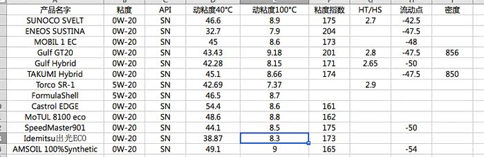 我做了一些功课,罗列了一些市面上的0w-20的机油参数。大家可以看到出光在低温流动性上非常出色,也就是说冬天非常适合。而且高温的保护也足够不错。因为有机钼的添加,所以非常适合honda的发动机来使用。那太阳这边就偏向性能一些些。100度的抗剪切会高一些。另外hths,也来到了2.7..