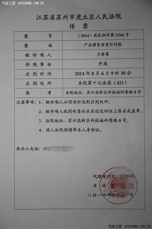 苏州高新区科技城科秀路8号,苏州虎丘法院,民事初审第1344号,第21法庭,4楼424室。 2014年9月11日 9时30分 ,第二次公开开庭审理万春雷诉上海大众汽车及其授权经销商汽车质量及销售侵权案。只需出示有效身份证即可参与旁听。