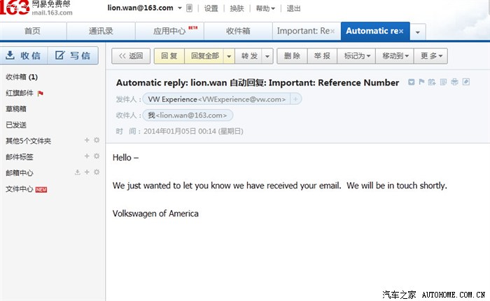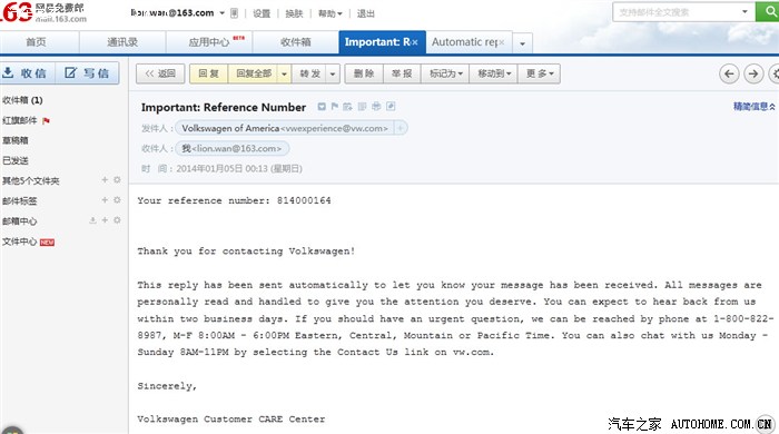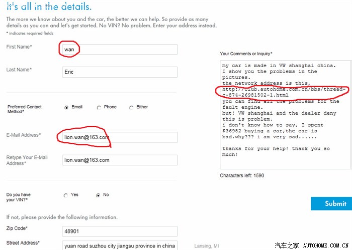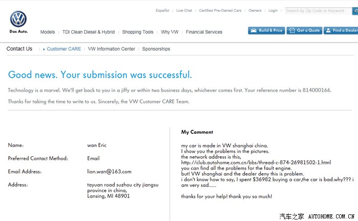 大众美国客诉邮箱:VWCustomerCARE@vw.com