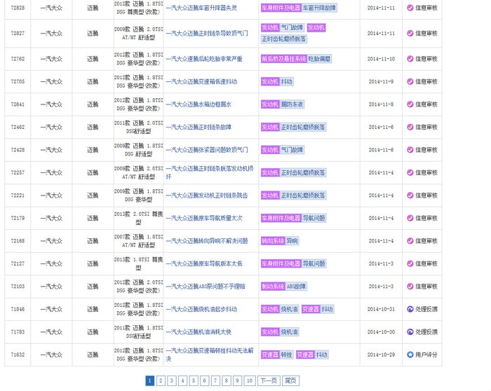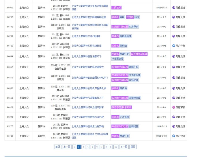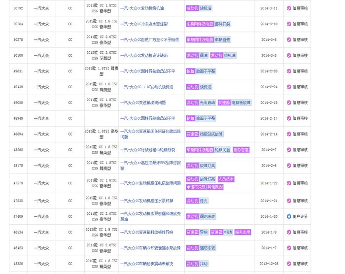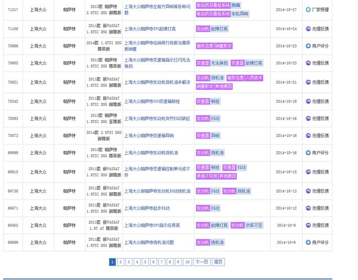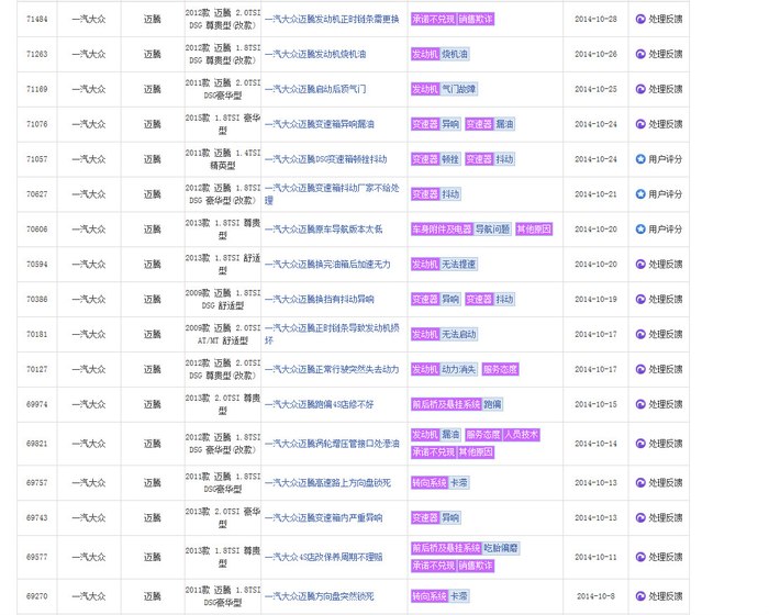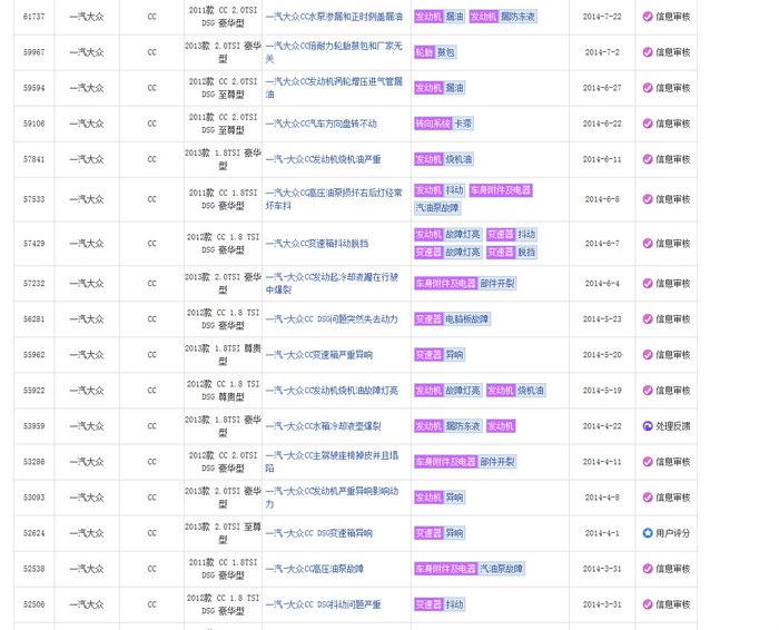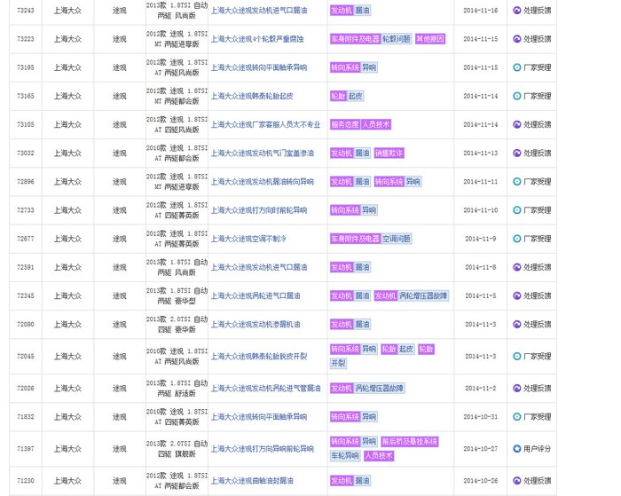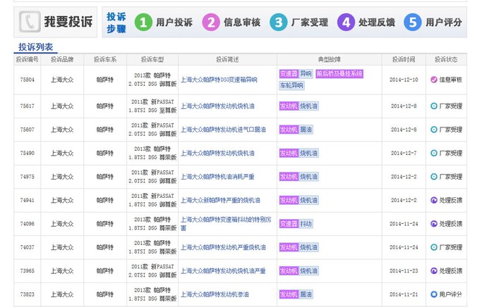 在中国汽车质量网选择大众,分别选择途观,帕萨特,迈腾,尚酷。。。里面事实记录了EA888机油泄漏,烧机油,EPC,正时跳齿等大量讯息。厂商的选择大部分是更换喉箍和分离器,或给予金钱优惠保养,赠送机油,或告知一切正常。真是替消费者捏把汗,从技术本质上来说汽车工厂真是良心丧尽的节奏。