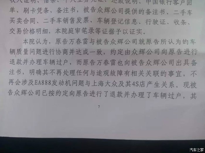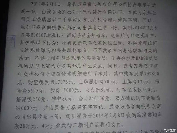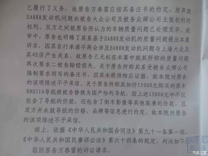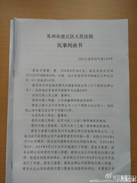 2015年6月18日,万春雷与上海大众汽车及其经销商为EA888发动机烧机油漏机油退车事实及损失赔偿诉讼在一年内经3次共12小时开庭后在今日判决了。法庭最终以诉求权力因被告手里的备注书(保证书)内容而不再具有主张权力为主因驳回原告所有诉求。赢在事实,输在法理关系。这是法官同志给我的总结。对于判决结果,是是非非留给人民群众看热闹和评判玩味。对于车厂要求保守车厂丑闻的要求,万春雷对德国大众汽车,上海大众汽车工厂表示:24万退车款你们买不了我的权力和自由,本人永远不可能接受这样的约束和胁迫。