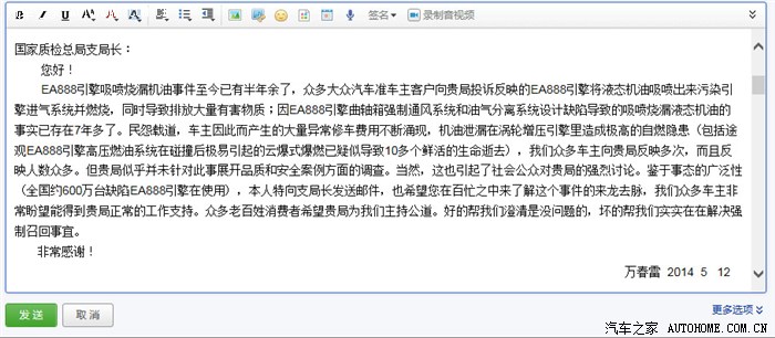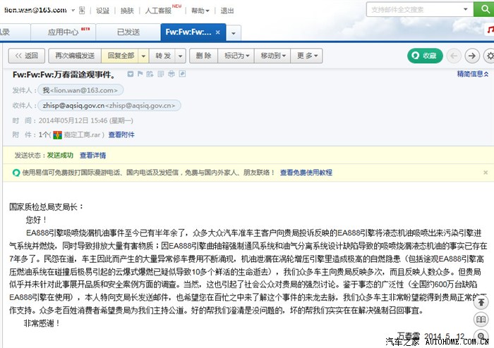 9月13日继续敦促联系国家质检其下属执法督察司,敦促职能部门适时公布你们答复我的缺陷调查鉴别进度及结果。同时与清华大学汽车系,吉林大学汽车系等高校建立交流渠道,从事实上与理论研究上相结合,力争撇开主观臆断,科学分析EA888频发机油泄露和曲轴箱通风管大量出现液态污秽机油的事实结果。同时提倡有发现一样或雷同问题的车主通过合法合理投诉渠道和方式方法处理事实问题,也敦促德国EA888中国设计制造技术团队勇敢现身为众多消费者传道授业解惑!请明确告诉消费者这个引擎多处严重机油泄漏和曲轴箱通风管内导出过量液态机油进入直喷引擎燃烧室消耗到底正常不正常?