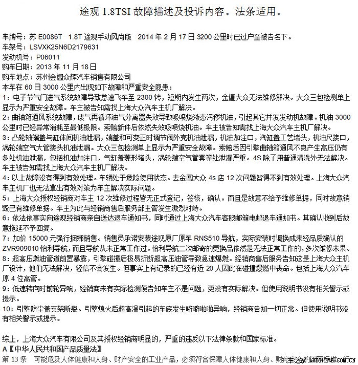 这里对汽车三包和汽车修理,更换,退货规范中“严重安全隐患”“严重质量缺陷”提示一下,其不仅包括会导致使用者生命安全,财产损失遭受侵害的质量问题,而且包括导致车辆起火的质量问题。这其中就包含机油泄漏。TSI涡轮增压引擎尤其如此。