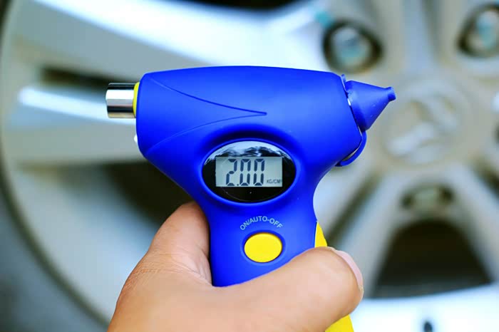 我先把这个二次放气的轮胎调至2.35kg/cm²的气压值。
