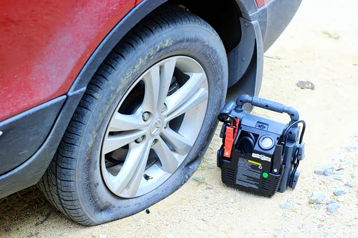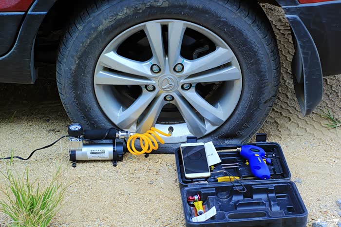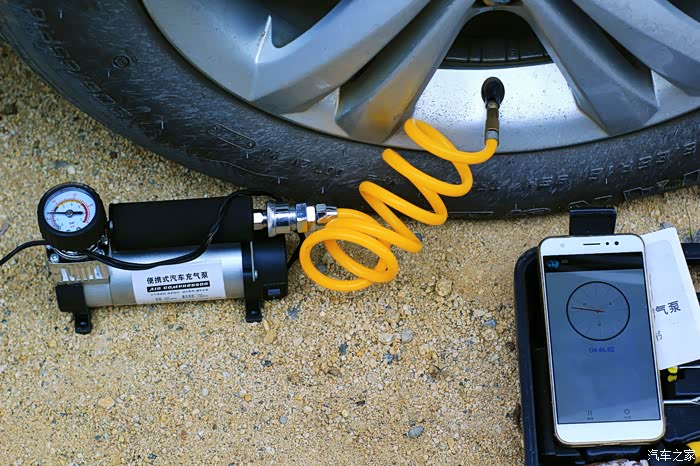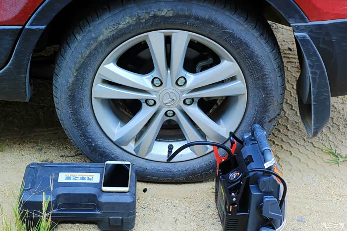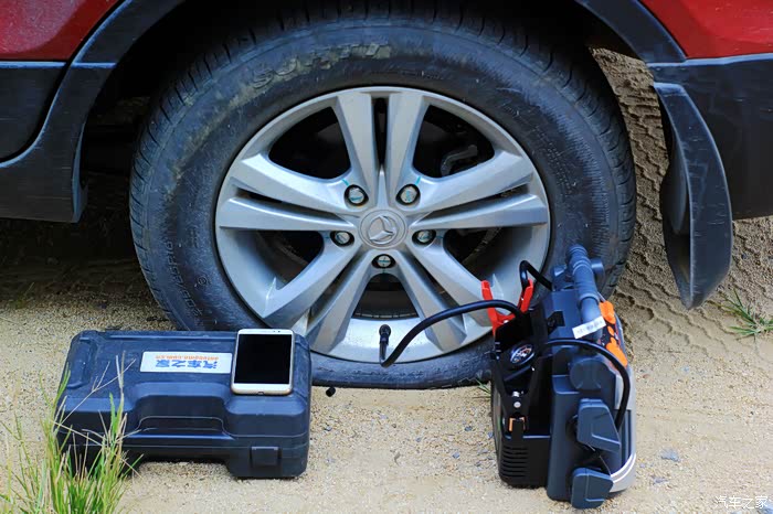 我将用这款应急电源的12V接口把我的三条轮胎都加点气,邓禄普应急电源做电源,汽车之家工具箱充气泵送气做动力。