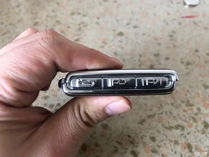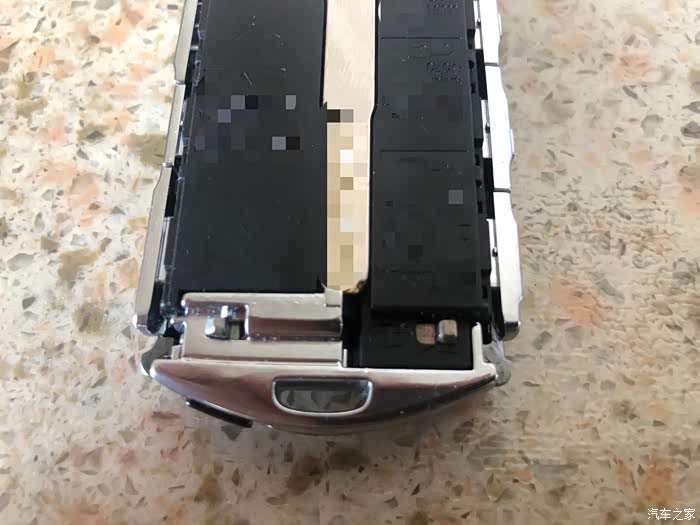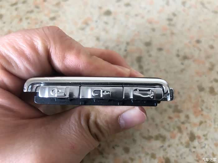 钥匙下面有个黑色的开关,这个是拆开钥匙壳的锁扣,把它向右推的同时,把上面的盖子往前推,就想以前的滑盖手机似的,一推就开。