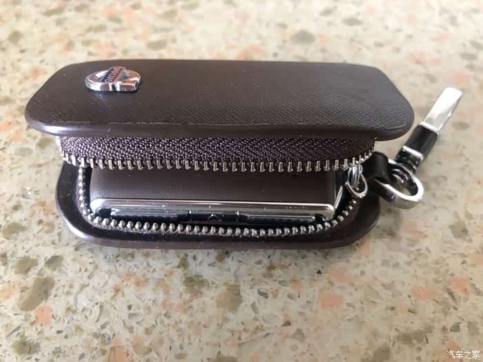 平时我的钥匙是这样的,外面有个保护套,在某宝上买的,如果不带无钥匙进入功能的话,不建议买这款钥匙保护套,因为保护套的尺寸刚刚好,拉链拉开非常费劲,而不拉开拉链,又按不动里面的按键。所以建议按键开车的朋友,还是买那种真皮的或者硅胶的保护套即可,这样的太费劲。