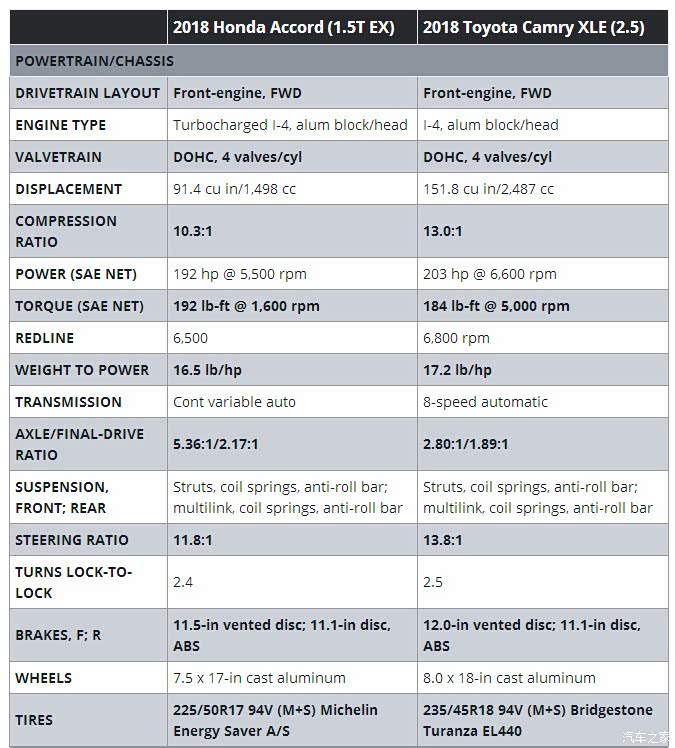 2018款凯美瑞2.5与2018款雅阁1.5T对比测试数据