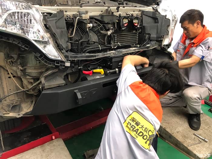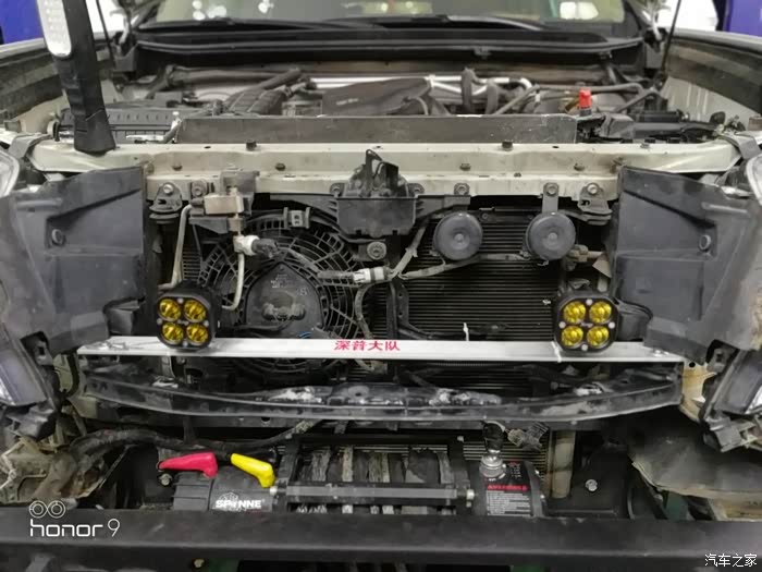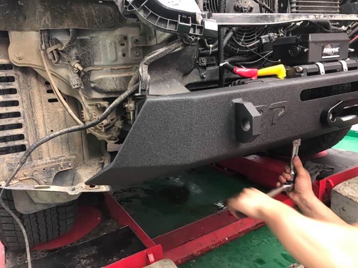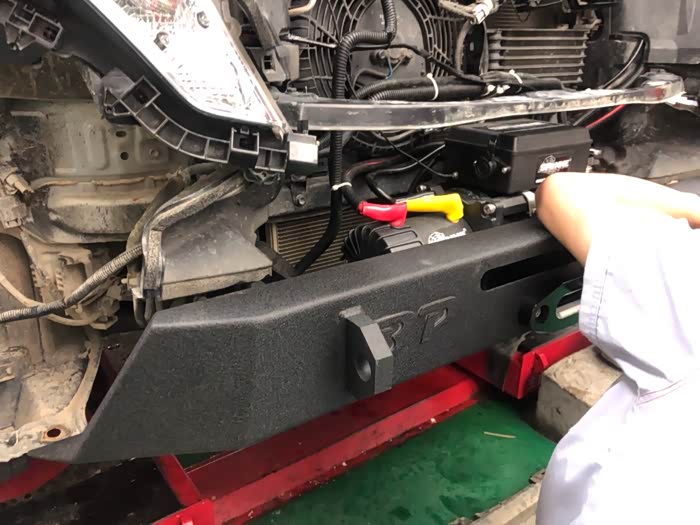 之前安装绞盘,因为只能装在防撞梁上面,所以绞盘的位置都比较高,绞盘的控制盒与前格栅固定梁有干涉,如果切除此梁,前脸会因为得不到支撑而下垂,而且在发生事故时,没有缓冲,水箱得不到保护。