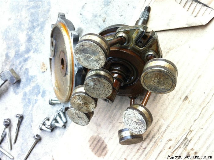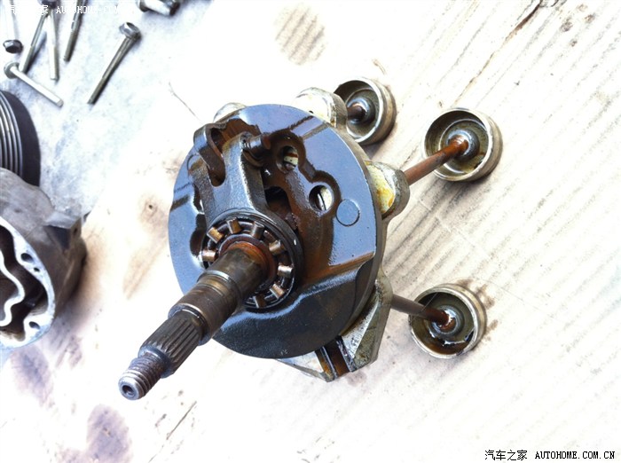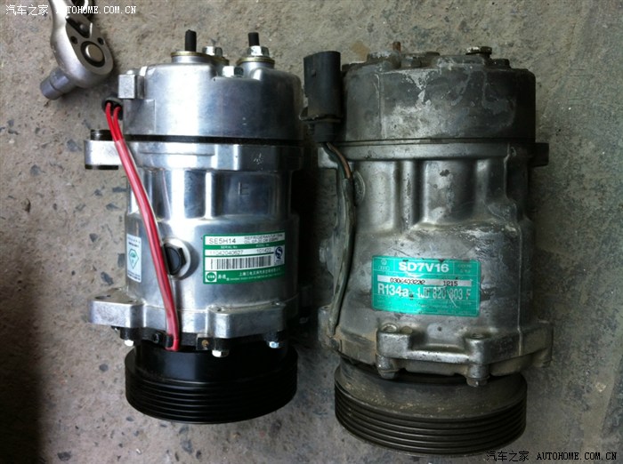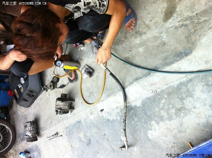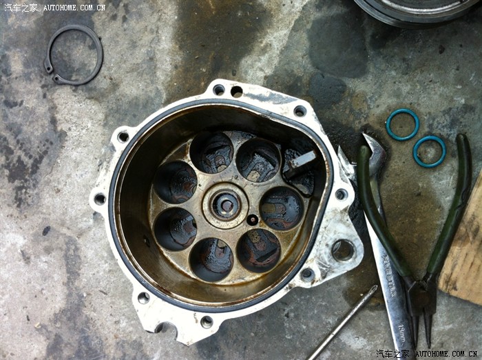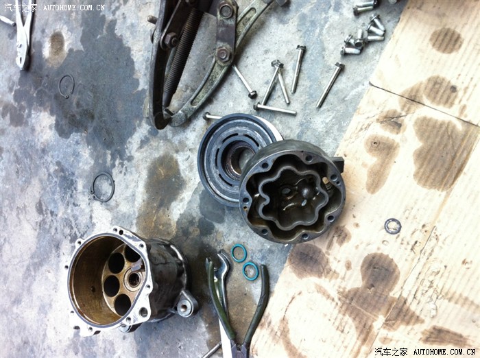 好热啊,装的过程抽空看了一旁的奇瑞东方之子,电子扇坏了造成压缩机抱死,压缩机全拆开了,老板说宝来的压缩机由于活塞上的活塞环是塑料的,修的话十个就有六个返工,后来就不建议拆开修了,像其它压缩机是钢环的还可以修的,看一下压缩机拆开的样子。