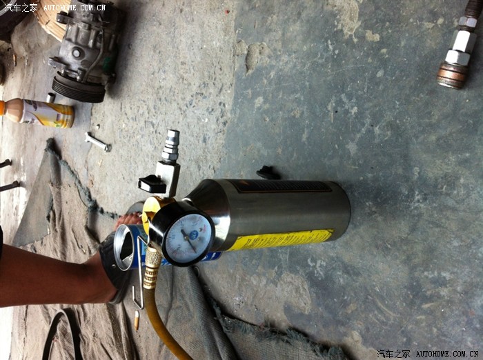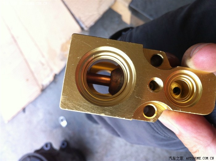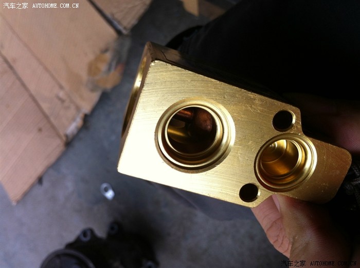 试压等了大概一二十分钟,完好,没有泄漏,接着抽真空,抽真空时发现高压气门芯漏气,换气门芯,紧接着第一个悲剧来了,拆气门芯时气门芯断在里面了(可能上次装的太紧了,这次师傅还是很仔细的),简直抓狂了,想想本来还半个小时就搞定的事,还有下午两点的会议,赶紧想办法呀,还好,店里工具足,以前也有同样的情况,拿来电钻对准气门芯钻下去,又找来反转罗丝,终于拧下来了,照片没有照,当时已经无语了,看着气门芯里面的铁销,头又大了,刚刚清洗的管道呀,可是没有办法呀,得保护新压缩机,拆!这次只拆了膨涨阀到干燥瓶端,又是清洗,半个小时后,终于弄好,抽真空,加氟,我心里那个高兴呀,终于弄好了,坐在车里等待加氟的感觉真好,哈哈!感觉马上春天就要来临了,咦!怎么加了三瓶了,还是不凉呀,拿温度计一测,我的妈呀,23.5度,和没换之前有什么区别?不知道怎么形容当时的感觉的,又热心里又不爽,压力表显示和没换之前一样,老板说换膨胀阀(我心里那个郁闷呀,原来我的压缩机没有坏呀,我修的几个地方都给说是不是膨胀阀坏了,没有一个听我的,都说没有问题,因为我关空调后每次膨胀阀这里就有很大的气流声),没办法,那就换吧!又是一顿拆。看一下新的,不知道是不是正品。