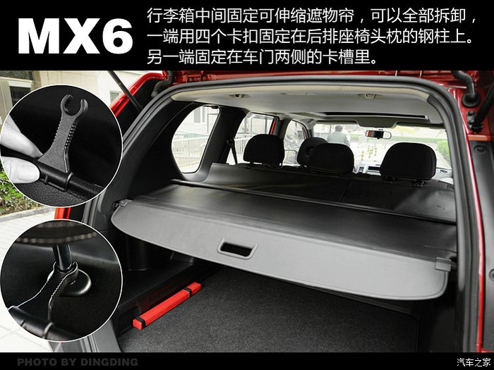MX6除了有方便的19个储物空间外,另一个贴心的设计就是行李箱有10个行李挂钩,固定货物和行李,防止在行进中倒下或移位。赞一个!