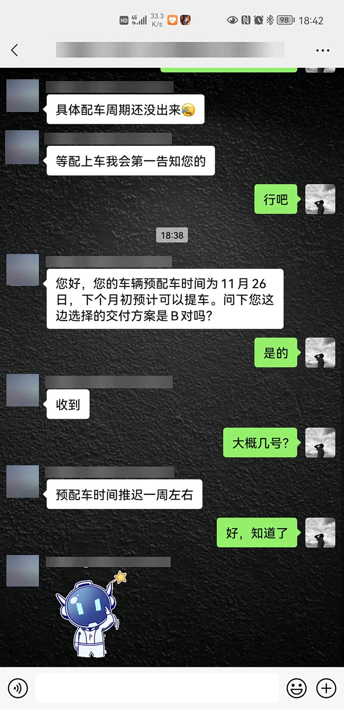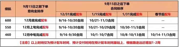 在签订合同没多长时间我的销售就拉了交付群,发了一些我订车的信息。中间也在小鹏APP里问了好几次客服大致的交付时间,大概十一月初的时候群里有人发了这张图,对应下来我的交付时间也到十二月上旬了【当时,长叹一声气,差点就退了所有的车友群,删小鹏APP了,省的每天望眼欲穿】