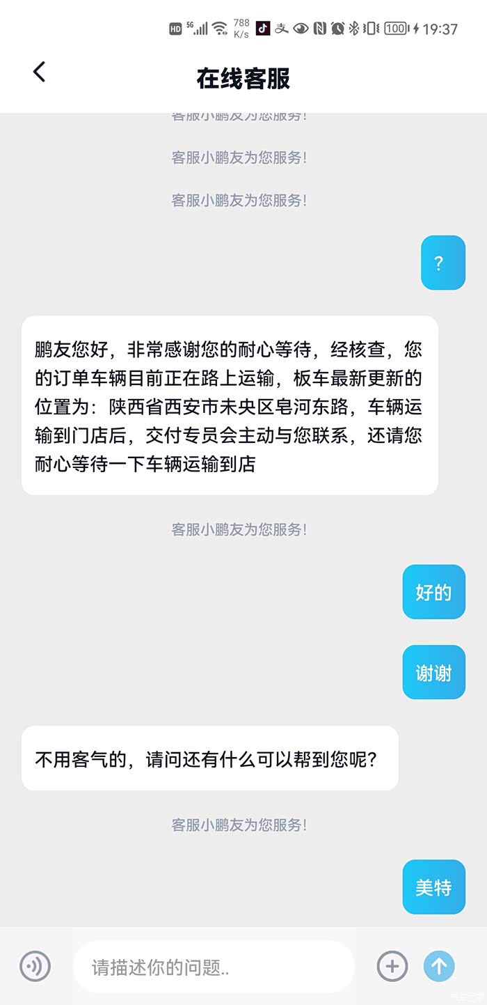从十八号开始,一切就好像按了加速键,二十一号中午小鹏APP提示配车,二十二号提示运输中,二十四号下午交付专员发来消息:车到了!!!【这中间每天都会去骚扰APP里的人工客服】