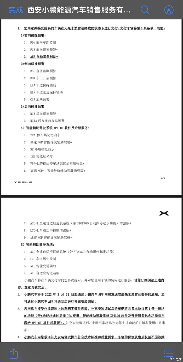 第一步,付尾款。可以刷储蓄卡、信用卡,微信、支付宝或者银行转账。没想到车这么快到,所以买理财的钱没来及赎回,所以就刷了一部分信用卡,后面等理财赎回来再还进去(话说华为的专属信用卡真不错,刷卡还有返现)。因为贷款所以车牌要他们代办,交了六百的代办费用。因为之前收到AB选项后,选择了后装雷达,交付推送了两个补充合同:一个是后装雷达的合同,包括此时不可用功能清单和补装雷达的说明,基本上所有的碰撞预警和智能辅助驾驶功能都不可用(后附图);另一个是补偿的免费XPilot服务协议,注意这个服务要在补装雷达之后才能激活【不得不说白嫖的真香】