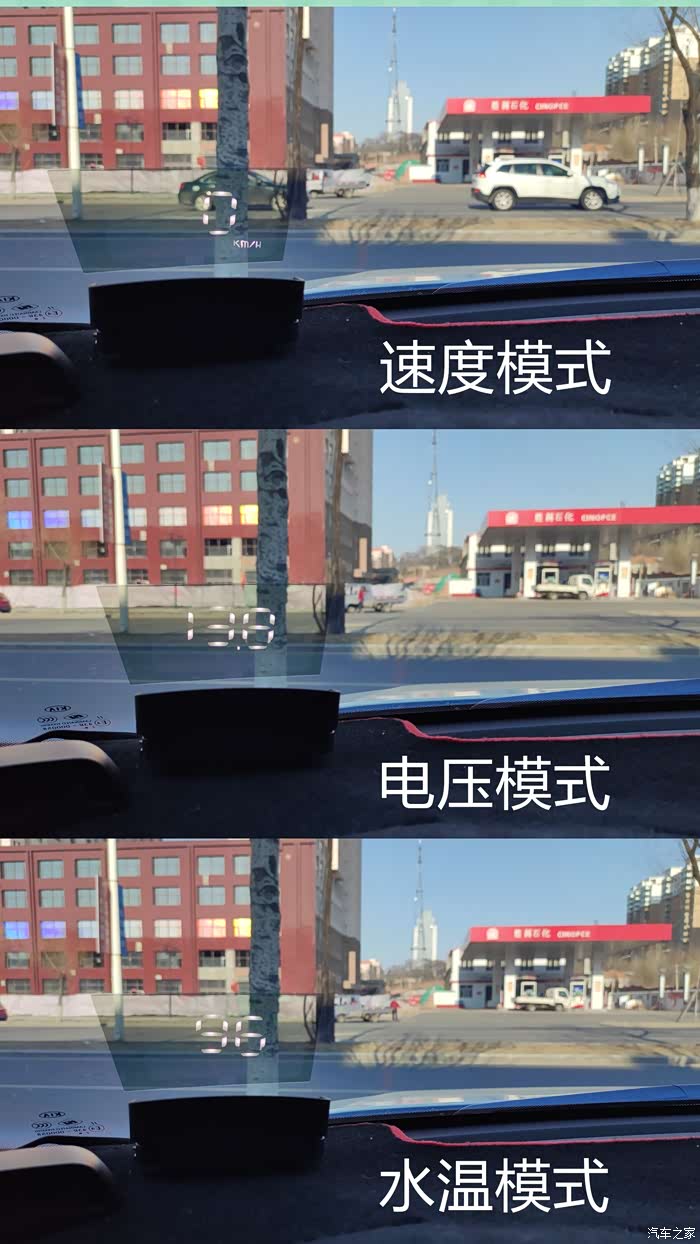 实际使用效果我在最常见的白天和夜晚市区路况上进行实地体验,受拍摄工具条件限制,实拍图片未能完美诠释三款HUD抬头显示的真实效果,我在这里用文字叙述,显示效果清晰,观察数据完全没有障碍。