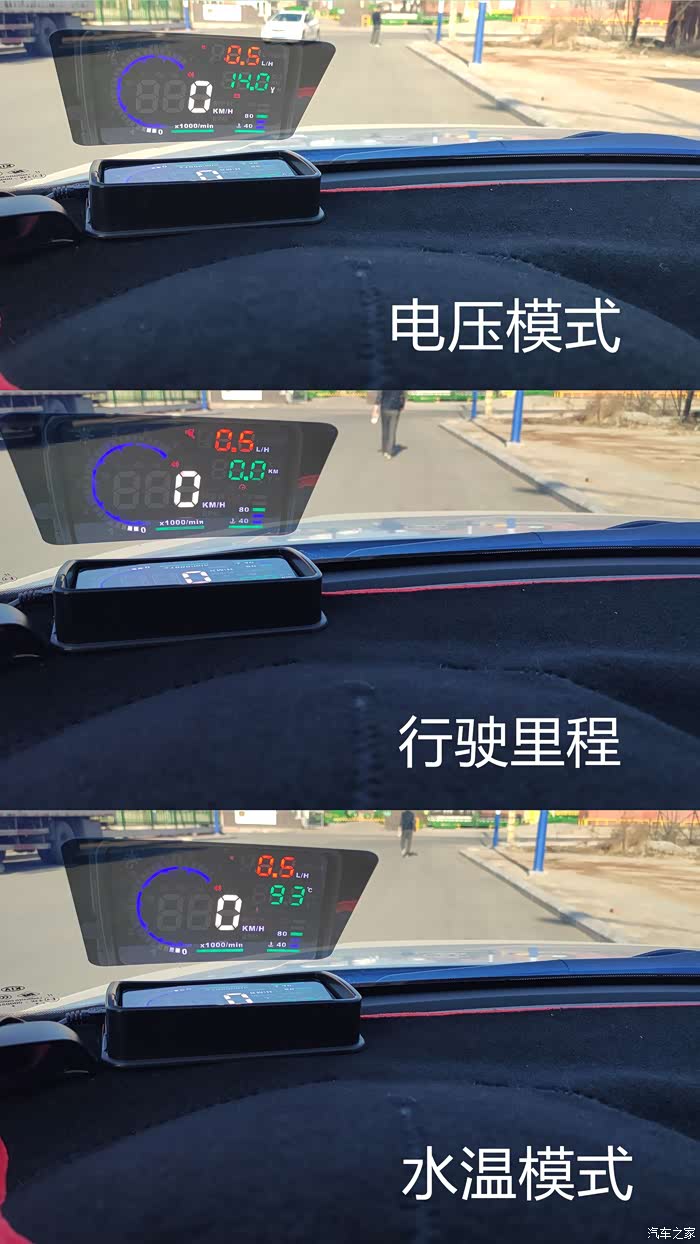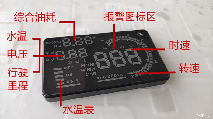 大有大的好处,功能方面也更加强大,屏幕可同时显示5种行车数据,除转速,时速,水温表,综合油耗四项固定数据显示外,还在一项可以在水温数值,电压,行驶里程三选一显示出来。