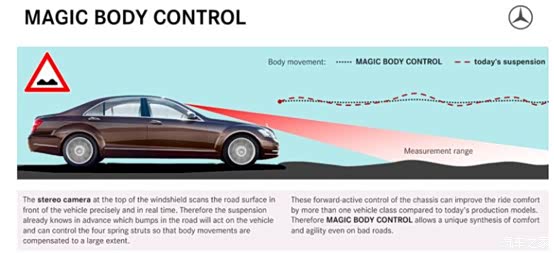下图显示了该技术的原理,相对以前的空气悬架遇到坑给你缓冲,这个魔毯就是提前通过传感器/摄像头,感应到坑,先给你把悬架高度软硬调好,这样过坑就如履平地。