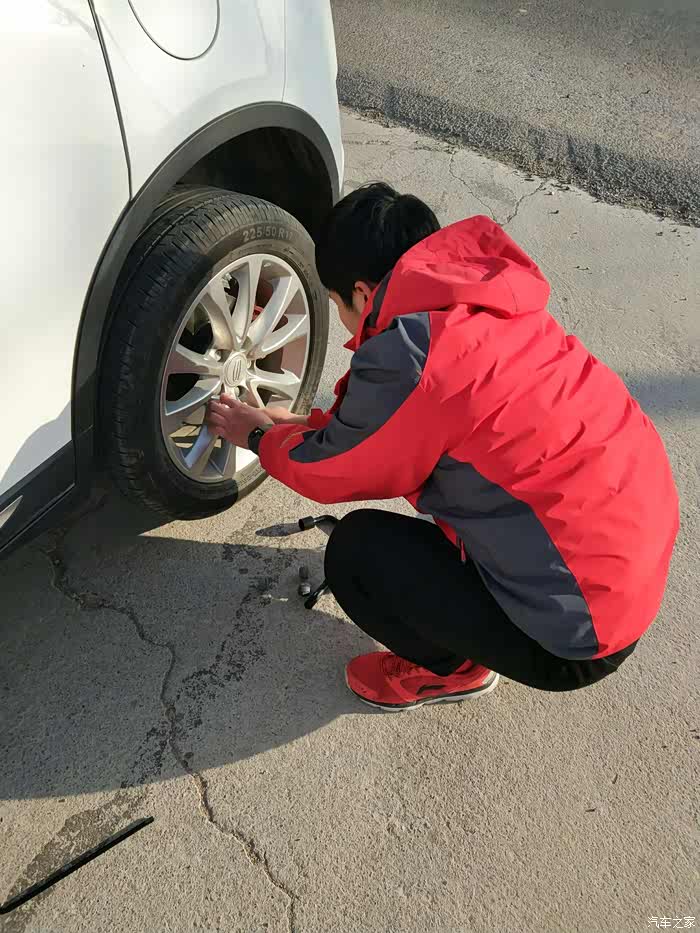 话说这胎压监测真管用,对于我这种不是经常开车的人来说,我也不确定是不是真的扎胎了,反正显示有问题哈,下车一看,哎,果然啊,凡事都有第一次,以前真的只是看过别人换过,确切的说,理论上我会,实际操作真的第一回。