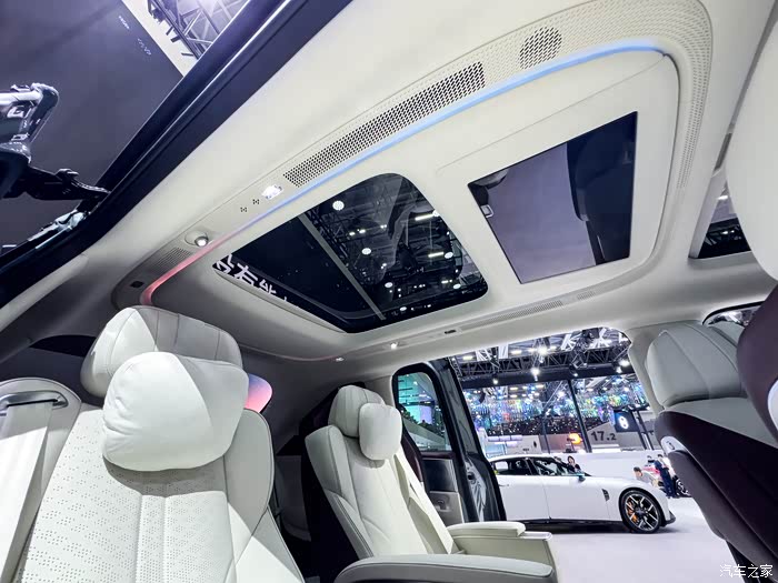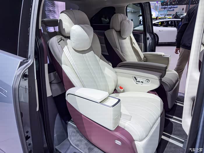 二排配备带安全气囊的零重力座椅,支持180°放平,前后排座椅均有按摩、通风和加热功能,两张航空座椅舒适度没得说,竟然还保留中间过道,这个对于第三排乘客上下车来说非常便捷,不错不错